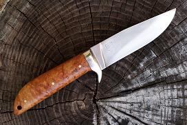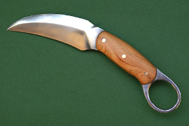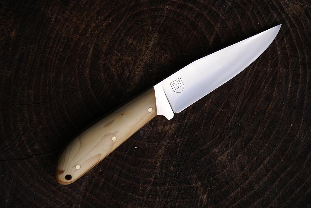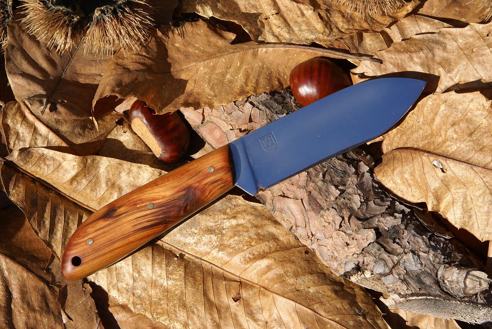 Acier 100C6, 9cm de lame, mitre intégrale, trempe sélective, 2.5mm d'epaisseur, manche en cade