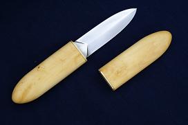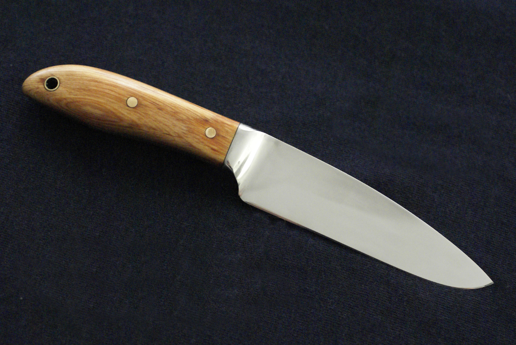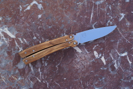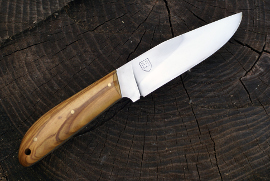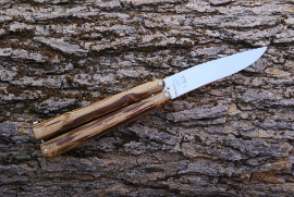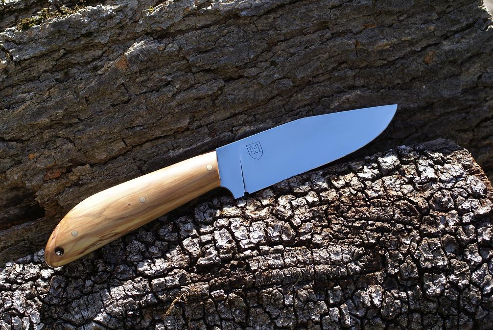 Acier XC75, 9cm de lame, montee en plate semelle, 3mm d'epaisseur, trempe selective, manche en olivier