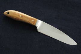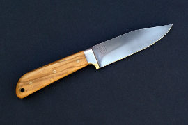 Acier XC75, 9cm de lame, 3mm d'epaisseur, montee en plate semelle, trempe selective, manche en olivier