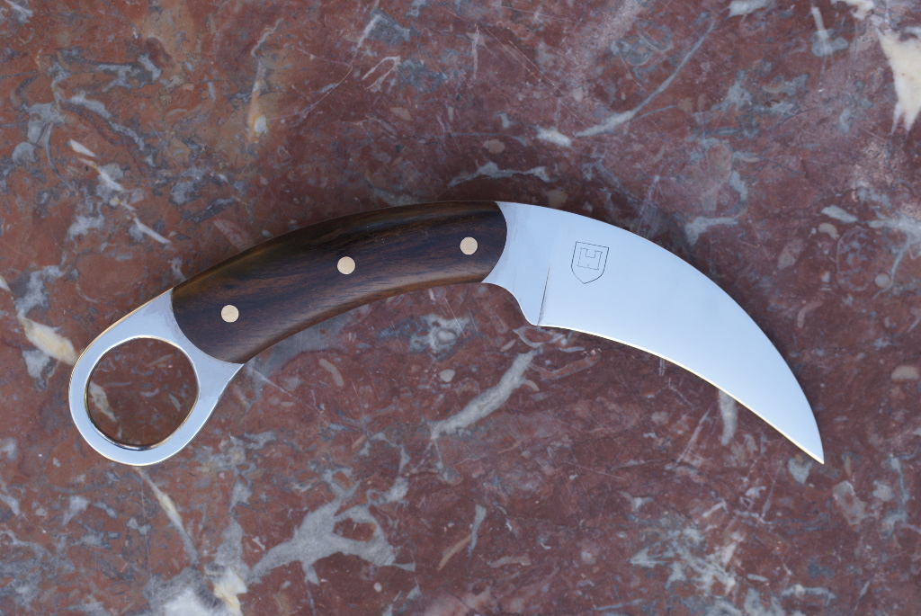 Acier 55NiCrMoV7 forge, 5mm d'epaisseur, 6cm de tranchant, manche en ebene, manche assymetrique pour une prise entre index et majeur ce qui permet une prise plus sure