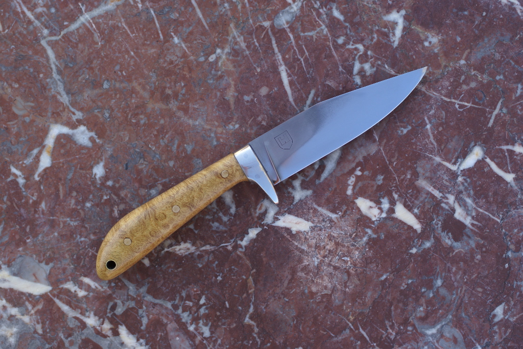 Acier 100C6 (52100), 9cm de lame, montee en plate semelle, 3.5mm d'epaisseur, trempe selective, manche en racine de bruyere