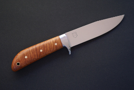 Acier 55NiCrMoV7, 12cm de lame, 4mm d'epaisseur, émouture plate , garde intégrale, large soie noyée rivetée (3 rivets traversants), manche en racine de bruyère