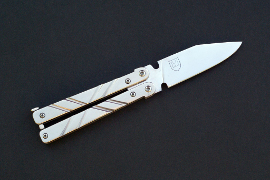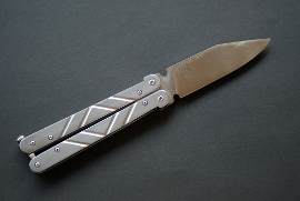 Acier 80CrV2, 6.5cm de lame, 3mm d'epaisseur, manche titane, trempe intégrale, pivots et visserie inox trempés