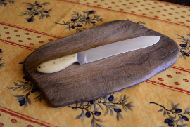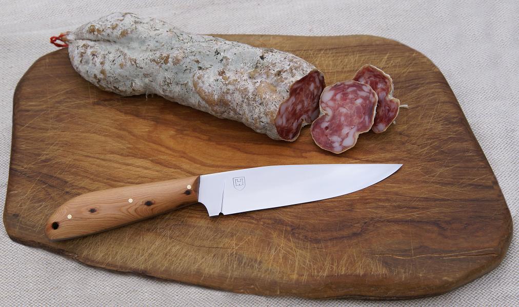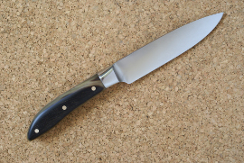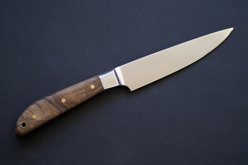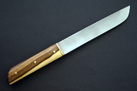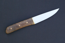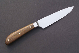 Acier 80CrV2, 1mm au plus epais, 9cm de tranchant, trempe intégrale, manche en noyer stabilisé
