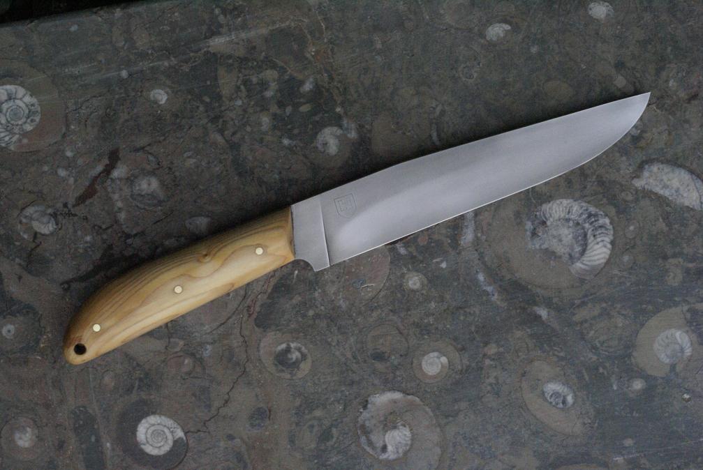 Acier XC75, 2.5mm au plus epais,20cm de tranchant, trempe sélective, manche en pistachier