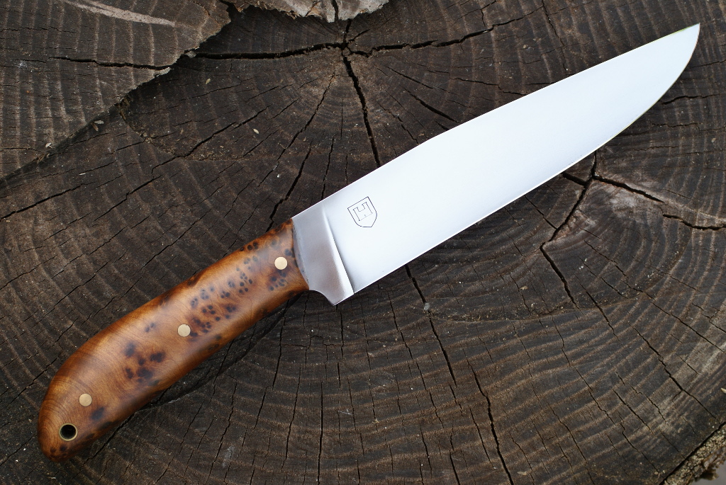 Acier de cémentation, 3mm au plus epais,15cm de tranchant, trempe intégrale, manche en thuya