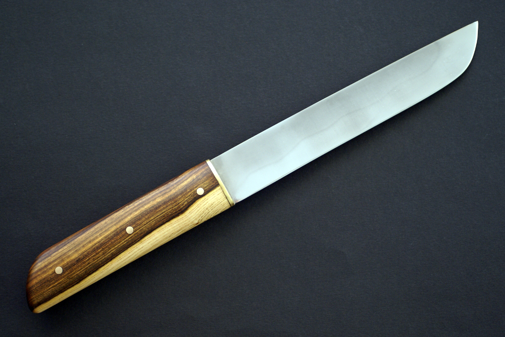 Acier XC130, 1.5mm au plus epais, 20cm de tranchant, trempe selective, manche en bocote